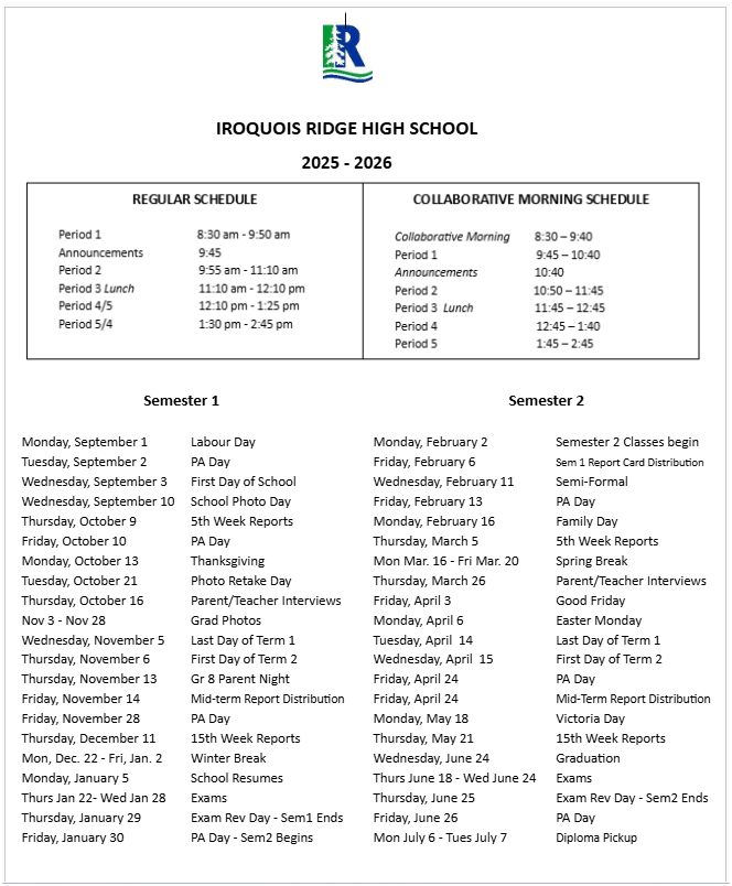 IRHS School Calendar