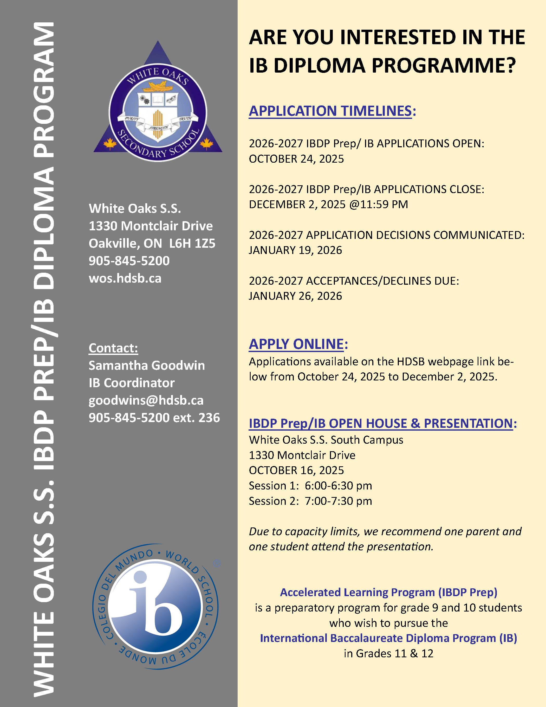 To ensure students are well-prepared, all HDSB IB schools offer an IBDP Prep Program in Grades 9 and 10. This preparatory pathway builds strong academic foundations and inquiry skills, helping students thrive in the challenges and opportunities of the Diploma Programme. While IBDP Prep Programs are available and highly recommended at IB schools, it is not required for entry into the formal Grade 11 IB Diploma Programme. Students may contact the school’s IB Coordinator for more information about entry in Grade 11.
